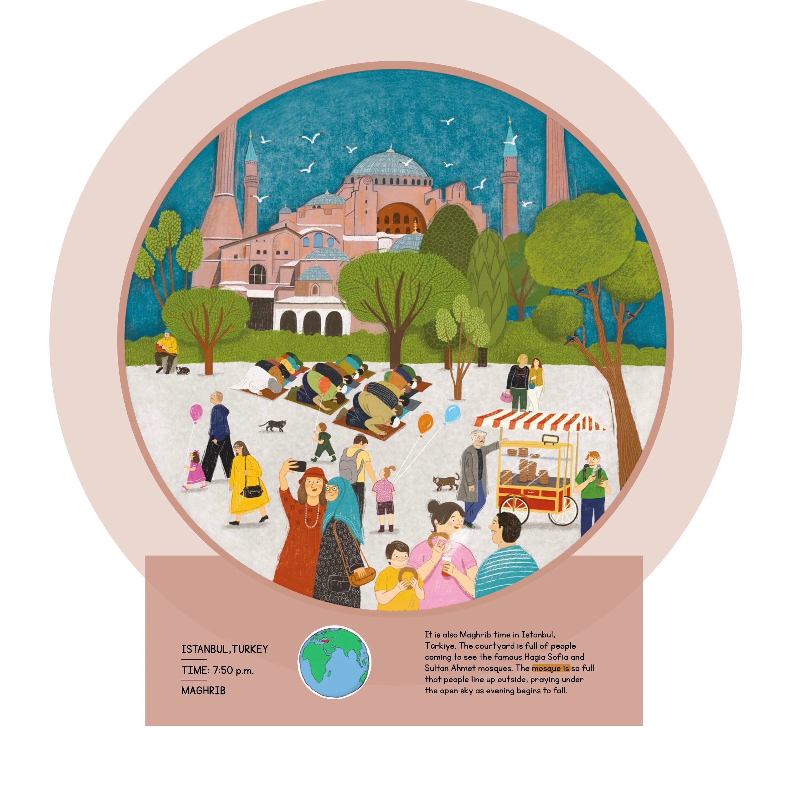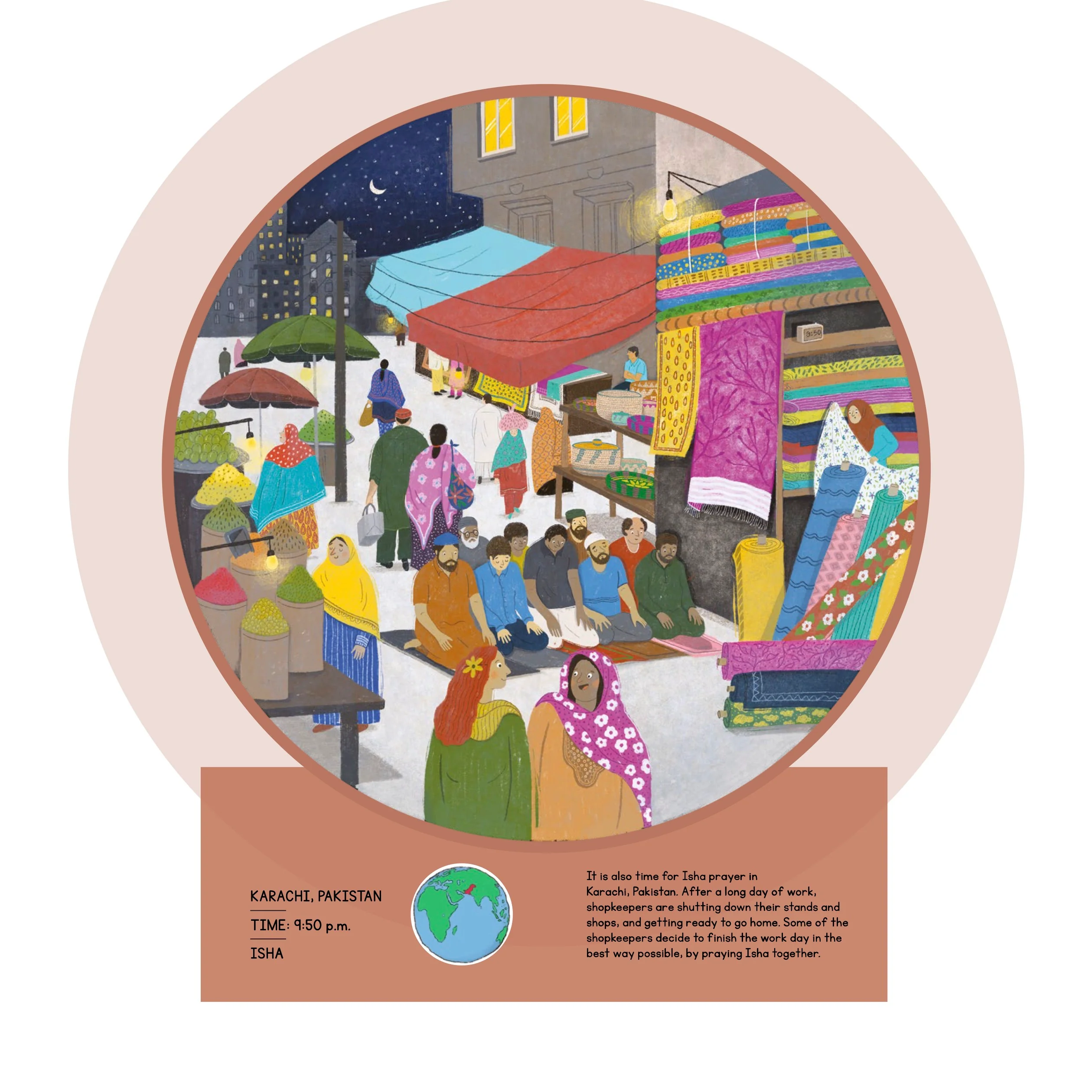 A World Always Praying is a beautifully crafted book with a unique circular shape, symbolizing the continuous connection of Muslims through prayer. Each page takes young readers on a journey across the world, showing how people from different cultures turn to Allah in salah.