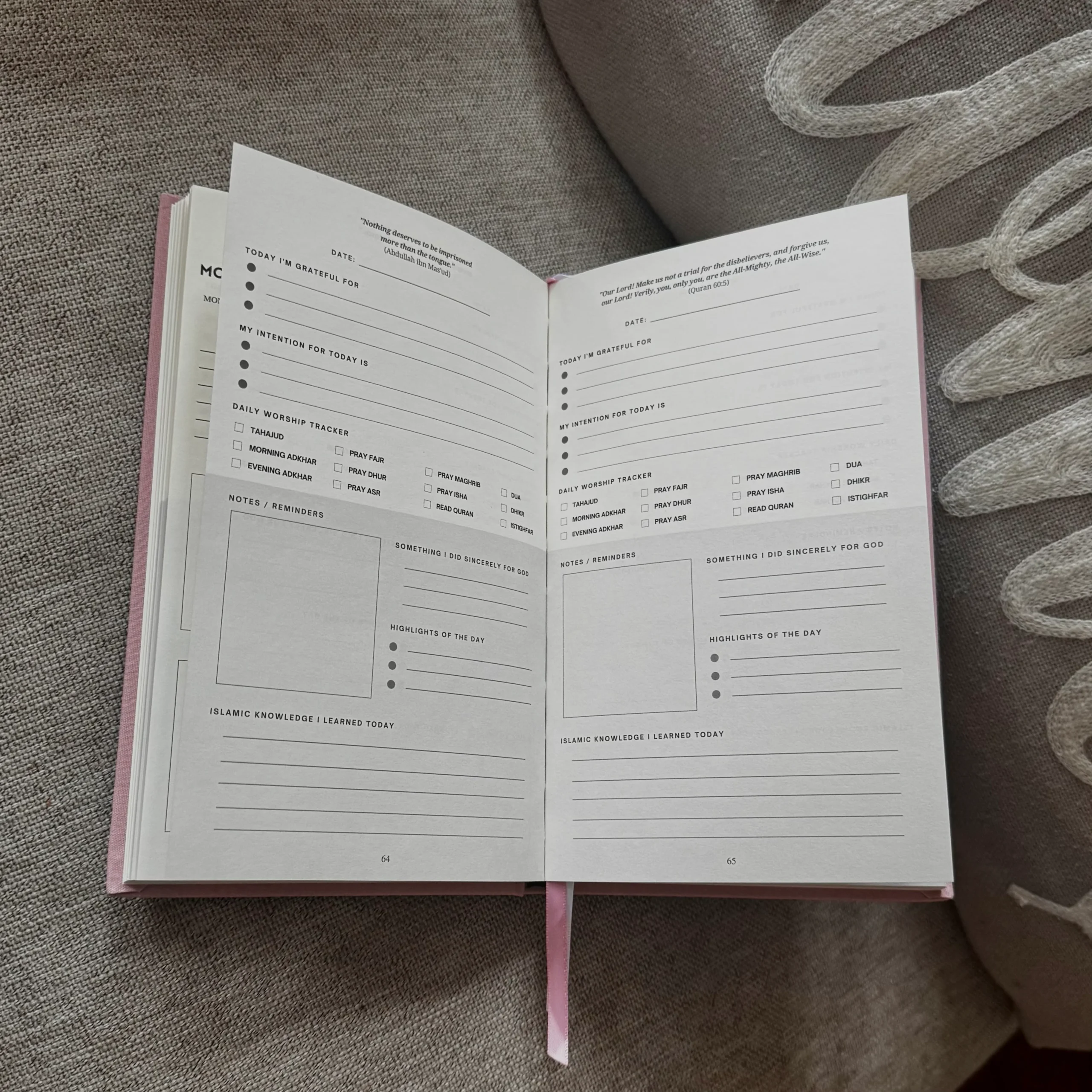 • Evening Guided Gratitude: End the day by reflecting on what you did sincerely for God, what your 3 highlights of the day was, and what Islamic knowledge you have gained.