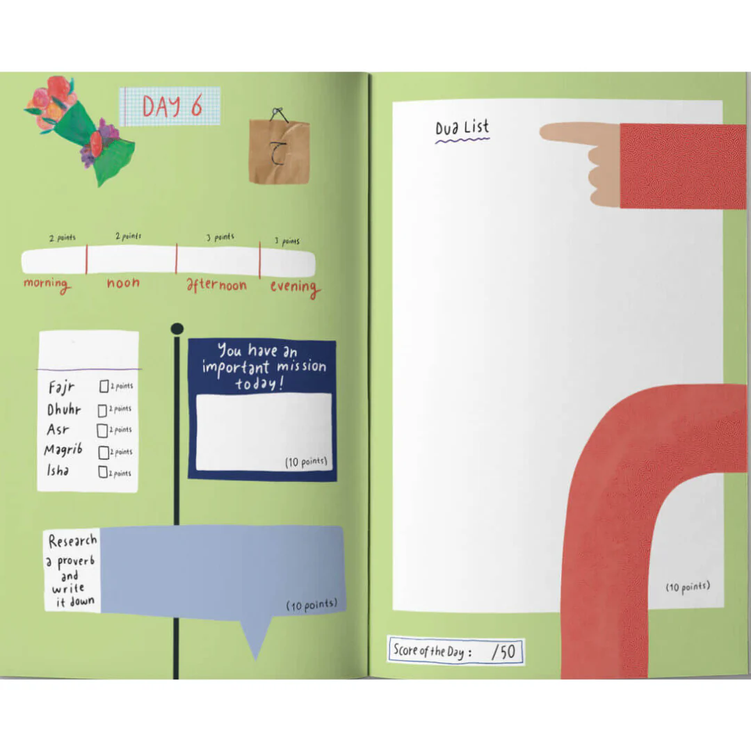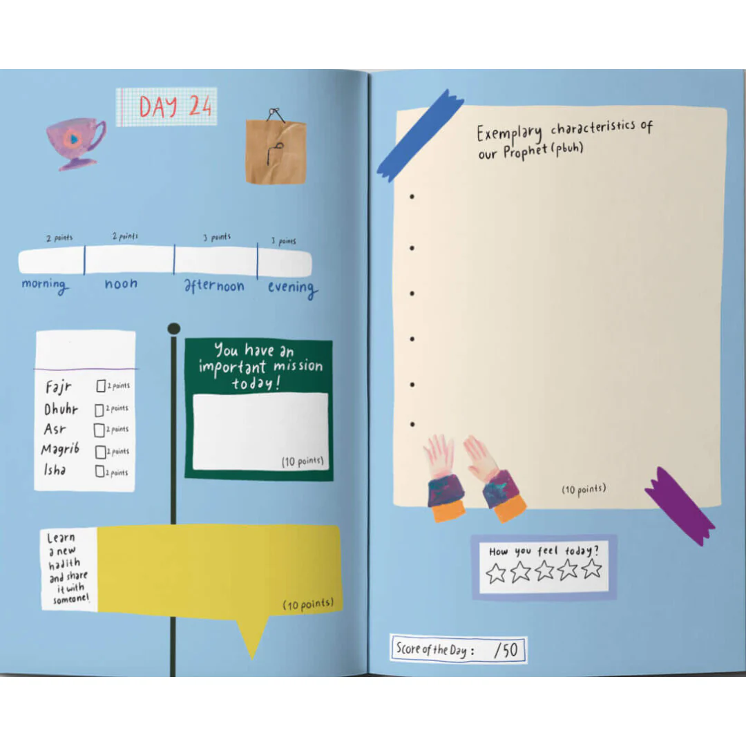 Through fun and interactive pages, children can record their daily thoughts, goals, and good deeds while learning about Islamic values and the importance of gratitude and patience.