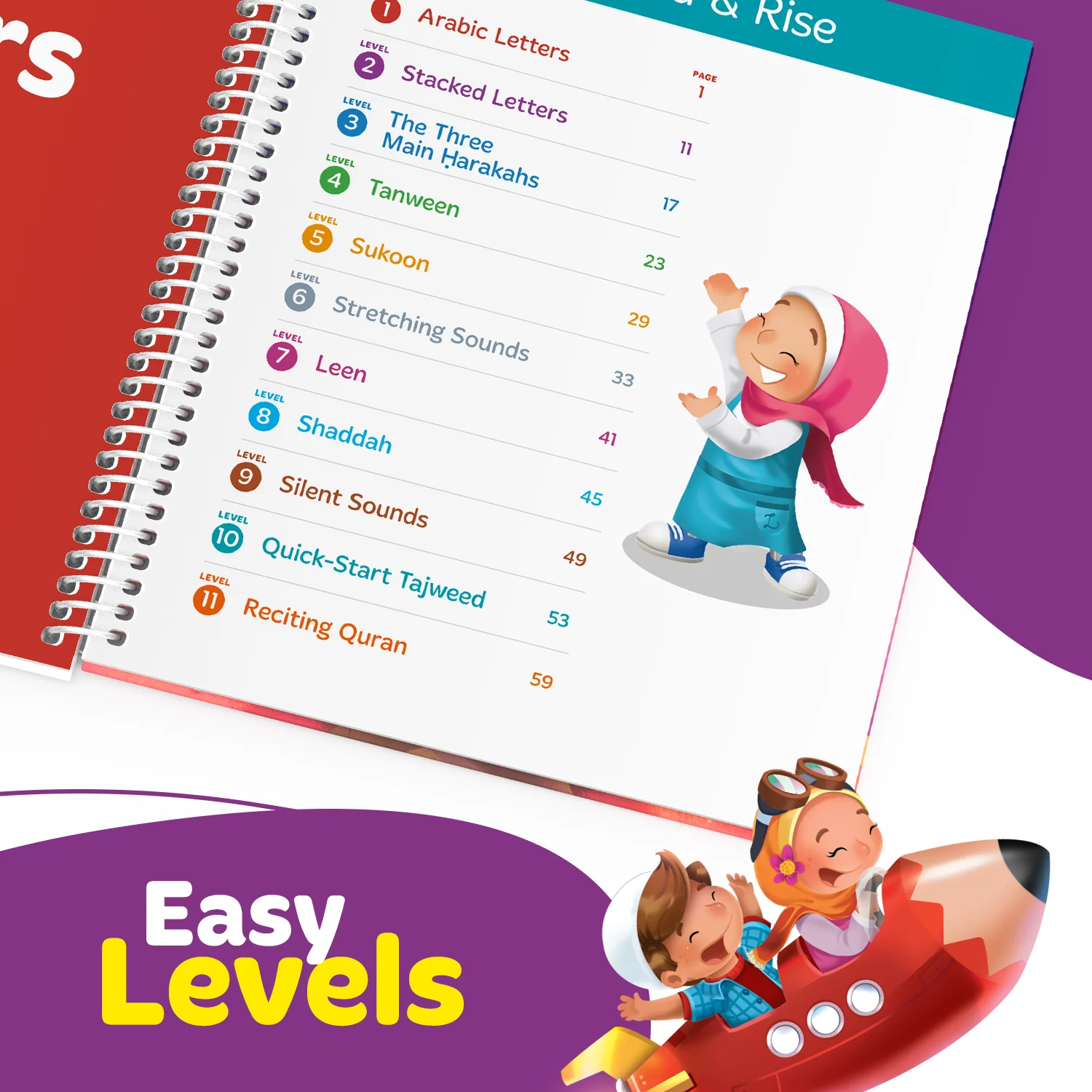 - Graded levels that take your child step by step from the alphabet all the way to reciting the Quran with tajweed.